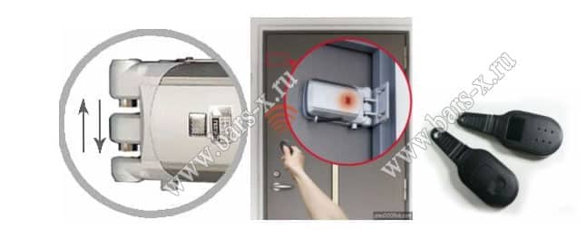 Блок управления замка сюрприз содержит приемник сигнала, который передается от радиобрелока, идентифицируется микропроцессором и посылается команда на разблокировку / блокировку замка электроприводом. В память блока управления этого замка можно запрограммировать до 12 радиобрелоков, а так же легко самостоятельно осуществлять перепрограммирование кодов брелоков в случае утери или кражи последних. Сюрприз так же работает от электричества, но снабжен аккумулятором, который автоматически начинает функционировать при отсутствии электричества. Подробнее..
