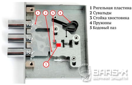 Три независимые системы запирания обеспечивают защиту от всех методов вскрытия. В основе конструкции лежит классическая технология «телескопических штифтов». Вторая составляющая - эксцентриковый штифт, защищающий от копирования ключей. Третья часть – запирающая планка с ответной нарезкой в форме змейки, расположенной продольно на плоскости ключа. |