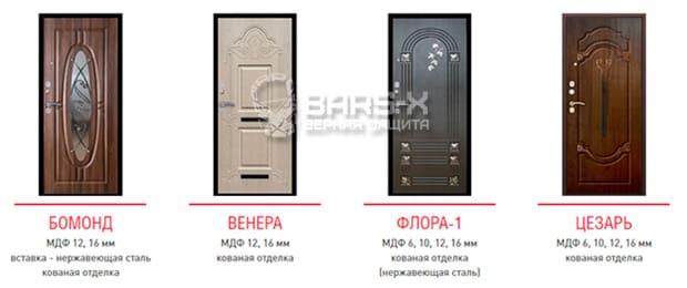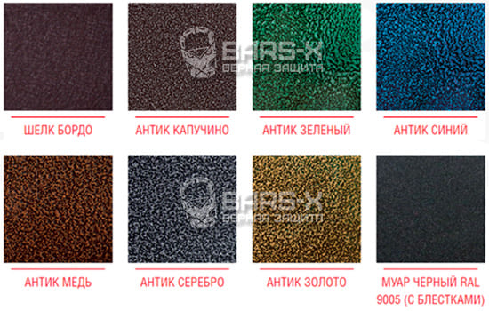 Фирма - производитель предлагает целый ряд модификаций декоративной отделки полотен для входных дверей «Аргус», в том числе эксклюзивные варианты. На поверхность металла наносят высокостойкое порошковое покрытие, в основе которого находятся полиэфирные смолы.