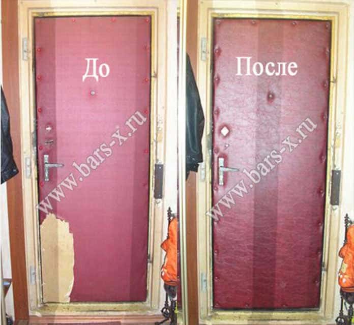 - переобивка двери или перетяжка - замена мягкой обивки. Старый материал полностью удаляется и на чистую дверь устанавливается новая обивка- винилкожа предложенная мастером во всех цветовых гаммах. «Барс-Х» предлагает более 40 видов цветов: от известных, стандартных, до изысканных.