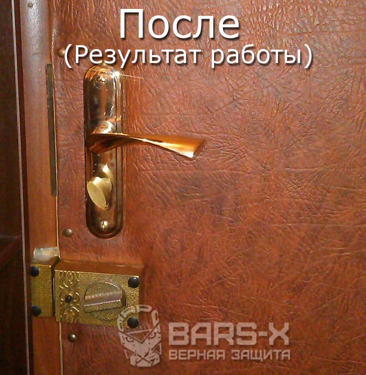 Нами выполнена замена замков в металлической двери. Вместо старого, изношенного и отнюдь не безопасного замка была установлена современная модель высокой секретности. Теперь владелец квартиры может спать спокойно, ведь его имущество находится под надежной защитой от посягательств злоумышленников. Желаете и себе модернизировать входную дверь путем замены дверного замка? Тогда обращайтесь в московскую сервисную службу «Барс-Х»!