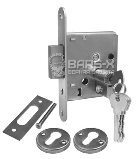 Первая модель – это дополнительный цилиндровый замок для входных дверей, который комплектуется не только крепежными элементами, но и стальными накладками.